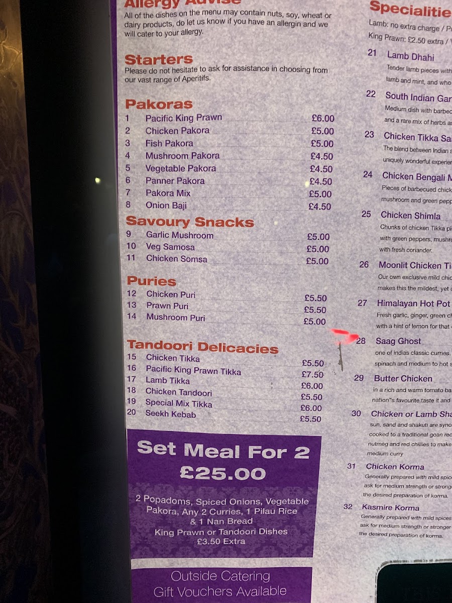 2 papadums, spiced onions, vegetable pakora, any 2 curries, 1 pilau rice & 1 naan bread, king prawn or tandoori dishes - £3.50 extra